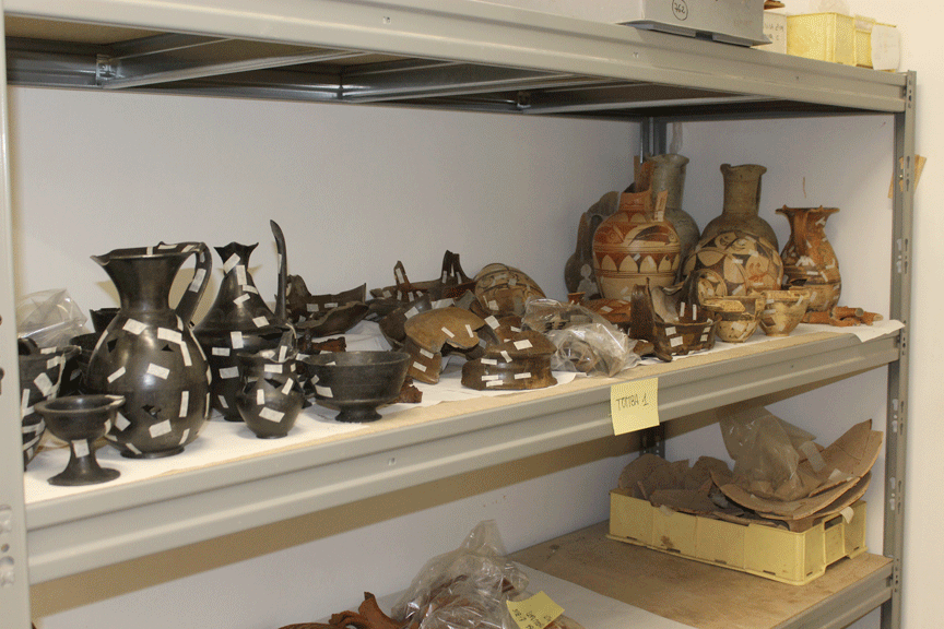 Il corredo della Tomba Gemina, scampato agli antichi profanatori, ha restituito centinaia di frammenti, al momento ancora in corso di ricomposizione, che hanno permesso di identificare circa un’ottantina di oggetti, perlopiù vasellame.