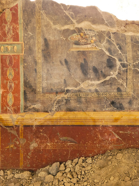Particolarmente numerose sono le evidenze dei lavori in corso nella casa con il panificio di Rustio Vero, dove è stata già documentata negli scorsi mesi una natura morta con la raffigurazione di una focaccia e un calice di vino.