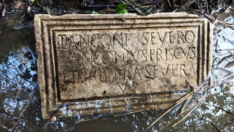 Lapide romana ritrovata in un fosso